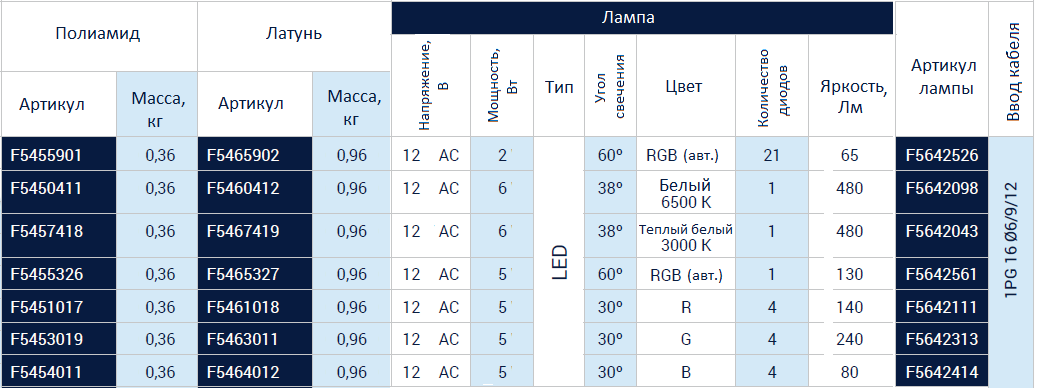 Подводный светильник Dichroic lightfixture, 1 диод, 38°, 12V.AC, 6W, LED теплый свет, латунь